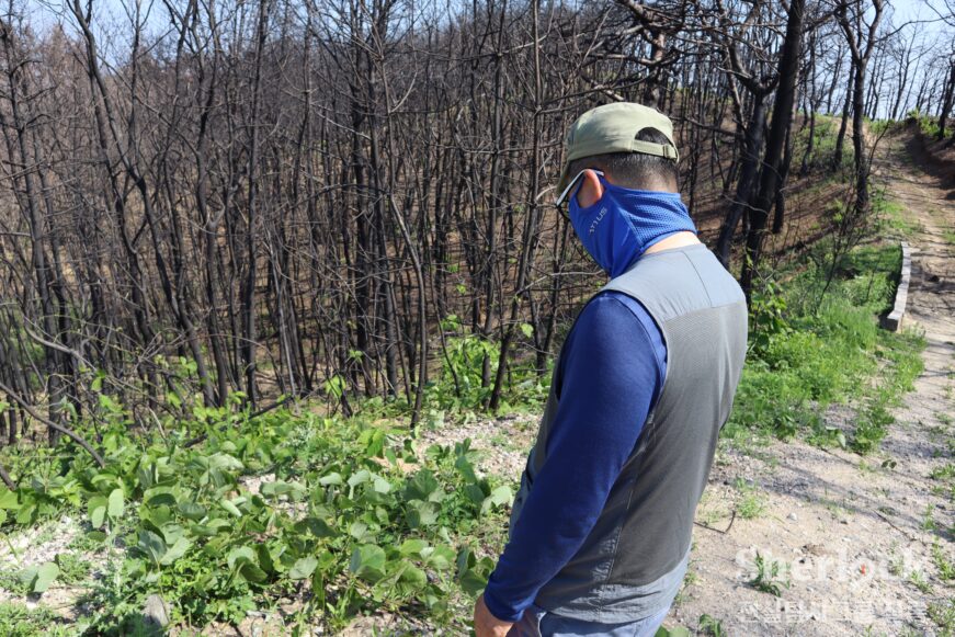 땅 위엔 타고 남은 타이어 조각과 녹슨 구릿빛 철사. 주변을 감싸고 있는 나무들은 새까맣게 변했다. 무언가를 모조리 태우고 남은 회색 잿가루가 ‘그날’의 긴박한 상황을 보여줬다. 화마(火魔)를 피해 달리던 산불감시원 신응국(1956년생) 씨의 마지막 하루를.