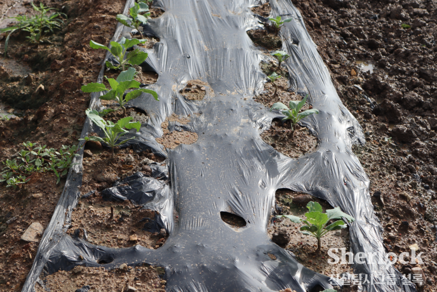 “친환경농업이니까 썩는 비닐을 쓰고 있어요. 일반 농업용 비닐에 비해 2~3배 비싼 편이에요. 그런데 날이 뜨거우니까 한 달 만에 썩는 비닐이 녹아버려요. 그게 또 문제더라고.“