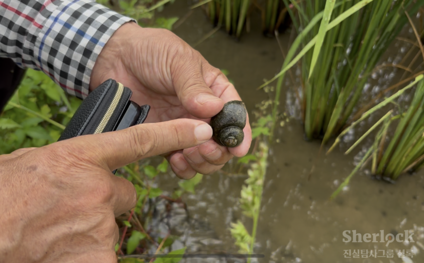 논에 괴어 있는 물속엔 작은 생명체가 꿈틀거렸다. 멀리서 보면 돌멩이처럼, 가까이 보면 달팽이처럼 보였다. 60대 친환경 농업인 김필승(가명) 씨는 손으로 이 생명체를 건져올려 보여줬다.