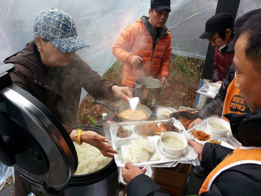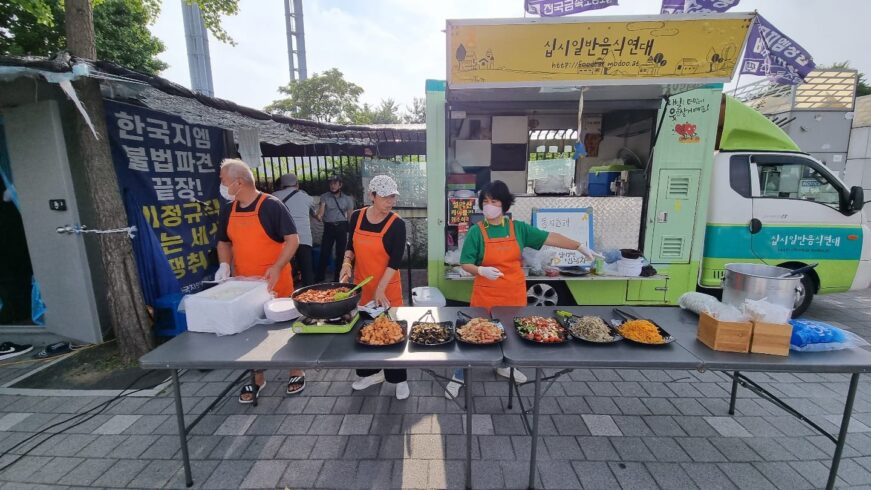 휴가 나온 아들 찬 하나라도 더 해 먹이고 싶어서 안달이 난 엄마처럼, 언니는 매일 다른 반찬에 다른 국에 심지어 김치까지 고루 돌아가며 준비를 하셨다. ‘나는 밤에라도 집에 오지, 이 추운 날 거리에서 한뎃잠을 자면서 있는 동지들을 생각하면 잠이 안 와’라는 말을 시작으로 설거지를 마치면, 다음 날 아침(식사) 준비가 끝나야 잠자리에 드신다. (성미선 글, 밥통 웹진 2019년 5월호)