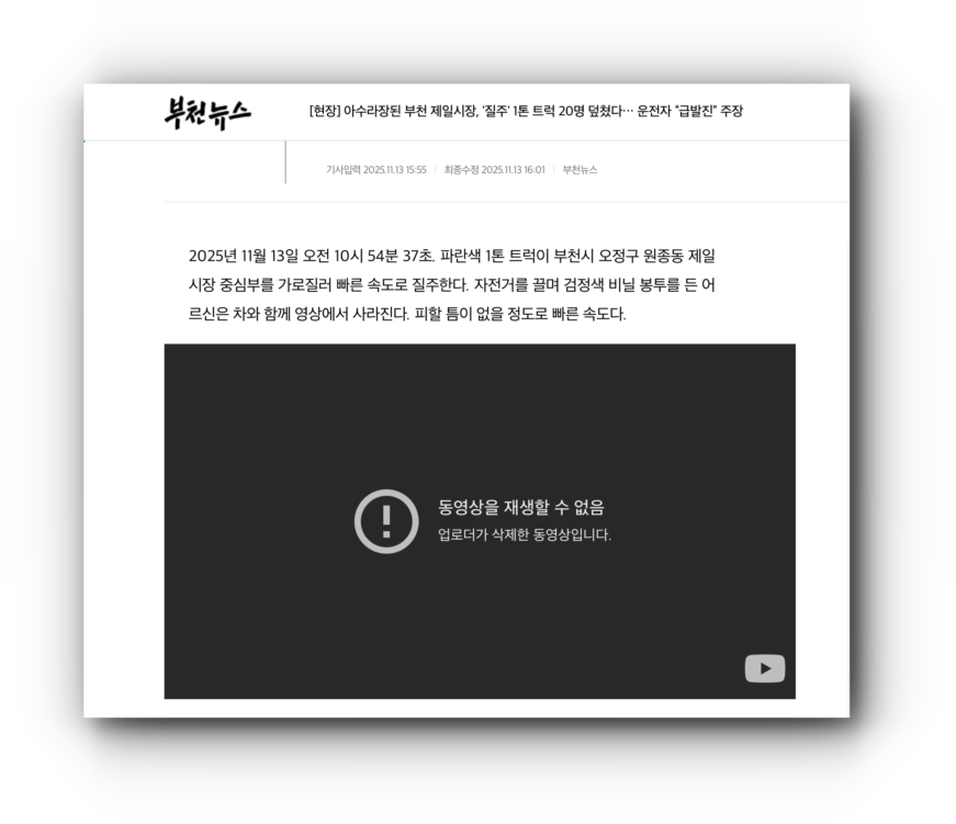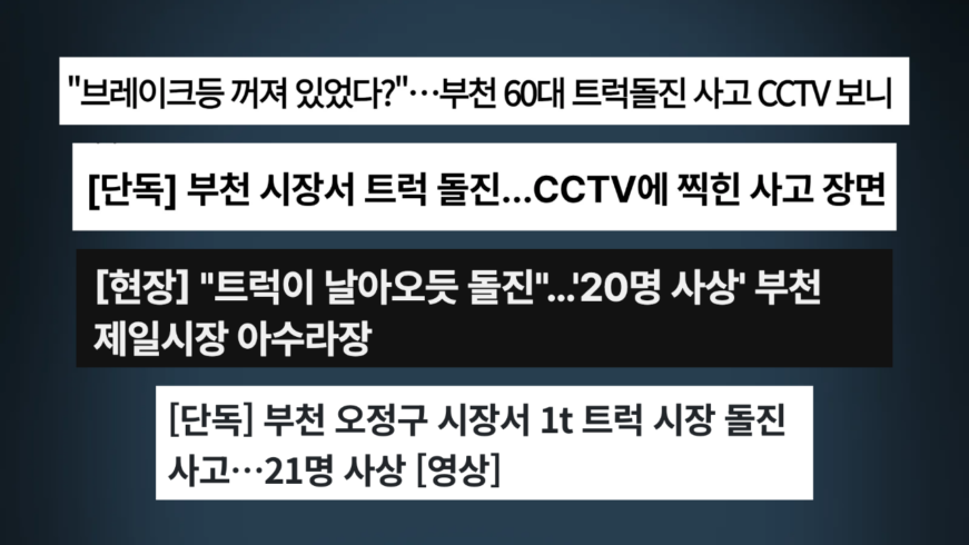 지난달 13일 부천 제일시장 골목에서 트럭이 돌진해 4명이 사망하고 18명이 다쳤다. 사고 이후 언론은 ‘이번에도’ CCTV 영상을 앞다퉈 보도했다.
