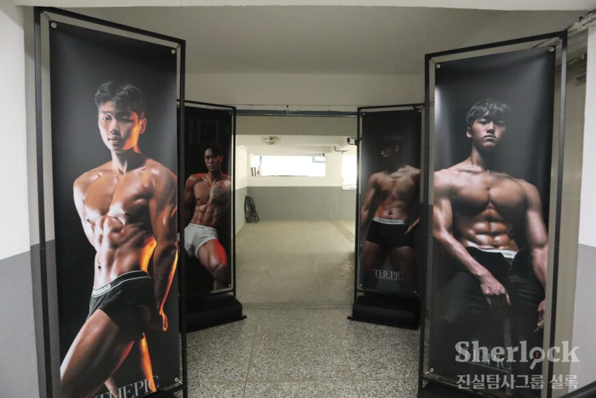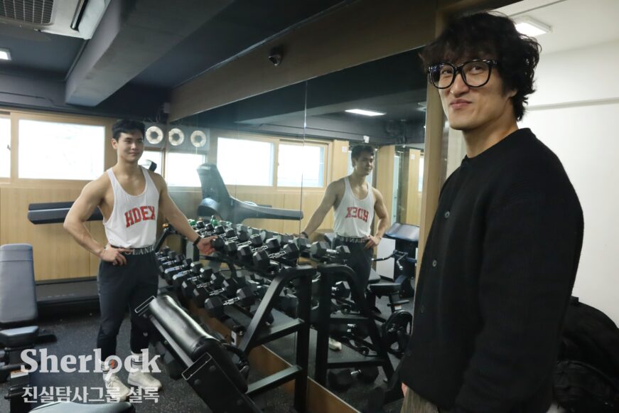 헬스장은 학교 건물 지하에 있다. 지하로 내려가는 계단부터, 헬스부 학생들의 보디프로필 사진이 전시돼 있었다. 학생들과 함께 수련처럼 몸을 만든 과정도 일일이 사진으로 담아 게시판에 걸어뒀다. 공고답게 헬스장 이름도 ‘머슬팩토리(Muscle Factory)’였다.