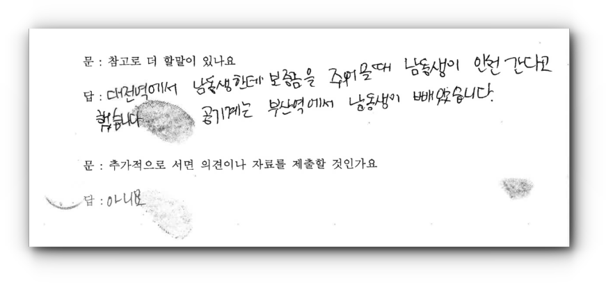 “대전역에서 남동생한테 보증금으로 줘어을 때 남동생이 인천 간다고 했습니다. 공기계는 부산역에서 남동생이 빼았습니다.”