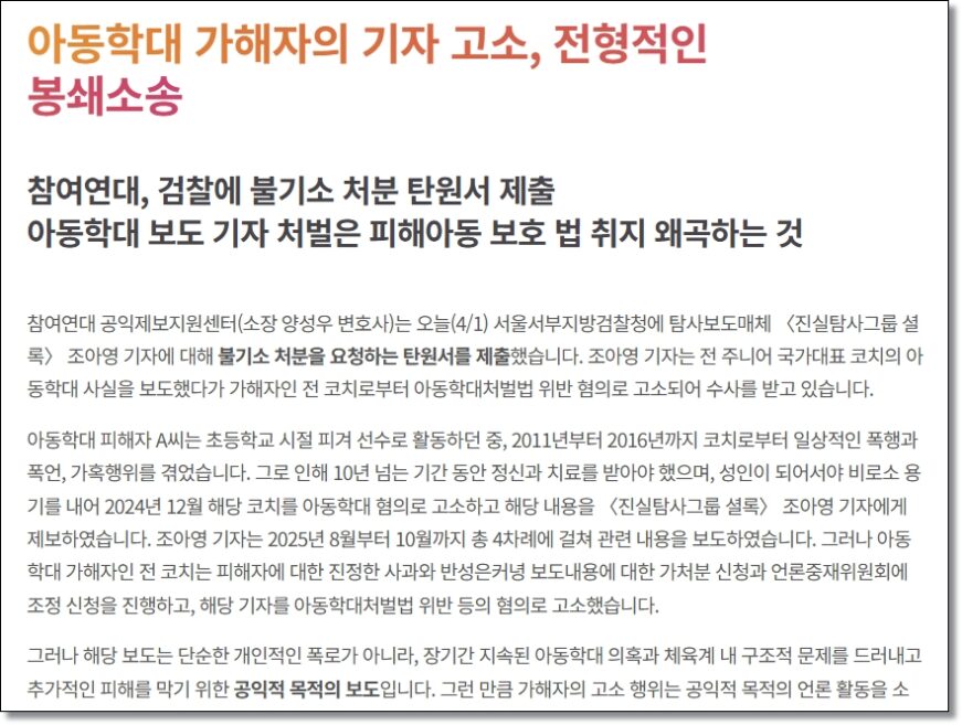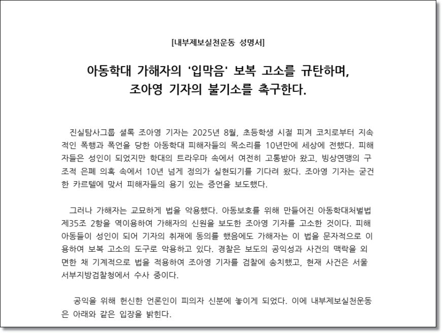 내부제보실천운동은 “피해자가 기자의 처벌을 걱정하며 탄원서를 써야 하는 이 현실이야말로, 우리 사회가 속히 바로잡아야 할 문제”라며 “검찰은 보도의 공익성과 정당성을 온전히 인정하고 즉각 불송치 결정을 내려야 한다”고 규탄했다.