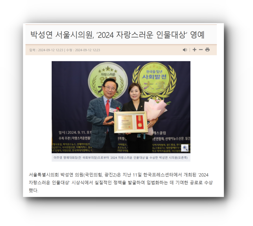 헌법상 원칙과 농지법상 규정에도 불구하고, 의원 임기 중 농지 매입과 개발 사업에 열심이었던 박성연 의원. 택지개발 사업이 한창이었을 2024년, 그는 ‘자랑스러운 인물대상’을 수상하기도 했다. 오는 6월 지방선거에선 재선 시의원에 도전하고 있다.