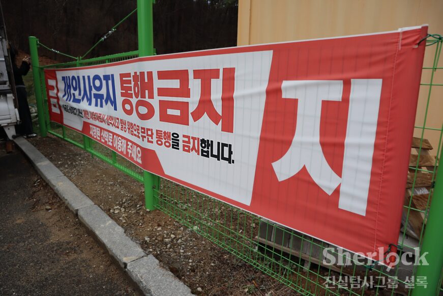 가까이 다가가 농지의 상태를 자세히 확인하고 싶었지만, 허리 높이의 초록색 펜스가 접근 자체를 막았다. 펜스에 걸린 현수막엔 ‘개인사유지 통행금지’ 문구가 빨간 글씨로 쓰여 있었다. 그 옆에 홀로 놓인 노란색 컨테이너 박스. 거기엔 이렇게 쓰여 있었다.