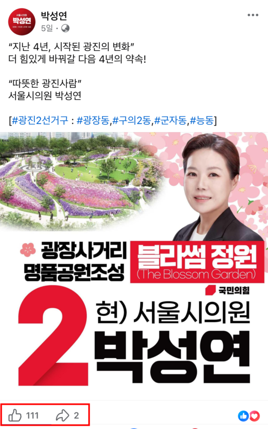 하지만 지금 박 의원의 활동 모습은 찾기가 어렵다. 개인 페이스북 계정에는 지난 17일경 “따뜻한 광진사람 서울시의원 박성연”이란 내용의 선거 홍보 이미지 한 장만을 올려두고 더 이상 게시물을 올리지 않고 있다.
