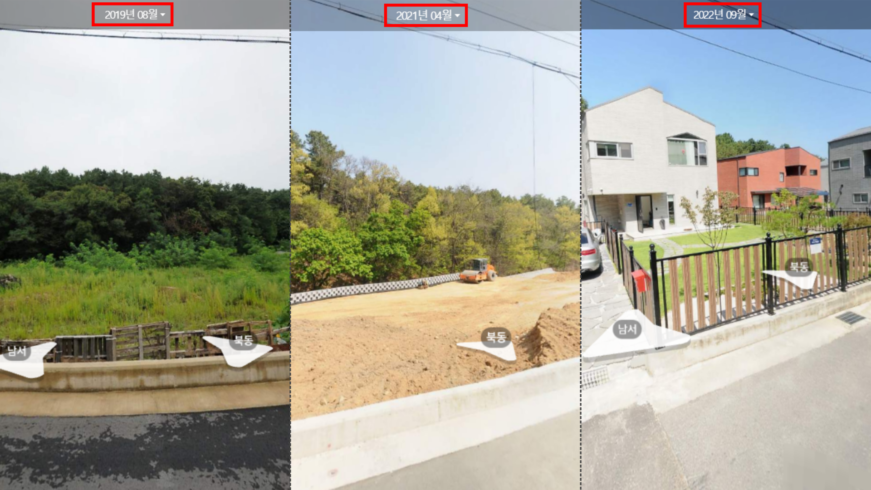2021년 4월에 찍힌 사진에는 더 이상 농지가 보이지 않았다. 우거진 풀은 온데간데없고 평탄화 작업을 마친 땅의 모습이 보였다. 그리고 2022년 9월 사진부터는 전원주택 단지가 조성된 모습으로 변신했다.