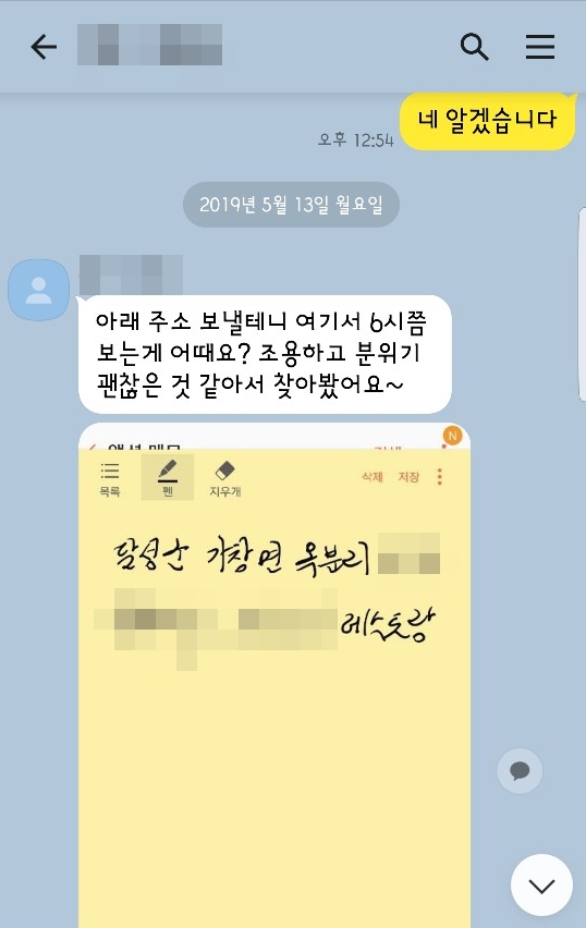 임 실장은 만남 요구는 반복됐다. 그가 정한 약속 장소는 대구 달서구, 남구 앞산 등 대개 영남공고에서 먼 곳이었다. 임 실장이 주로 식당을 예약했는데, 연인들에게나 어울릴 법한 ‘룸’으로 잡힌 적도 있다. 그에게 편한 장소는 강 교사에겐 불편했다.